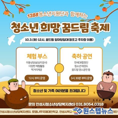 원스텝뉴스 천수호 기자 | 안성시청소년상담복지센터, 안성시학교밖청소년지원센터, 로뎀나무국제대안학교, 및 1388청소년지원단이 운영하는 청소년문화축제 “1388청소년지원단과 함께하는 청소년 희망 꿈드림 축제”를 오는 10월 3일 12시부터 17시 30분까지 안성시학교밖청소년지원센터 앞마당과 공도10호 어린이공원에서 진행된다.