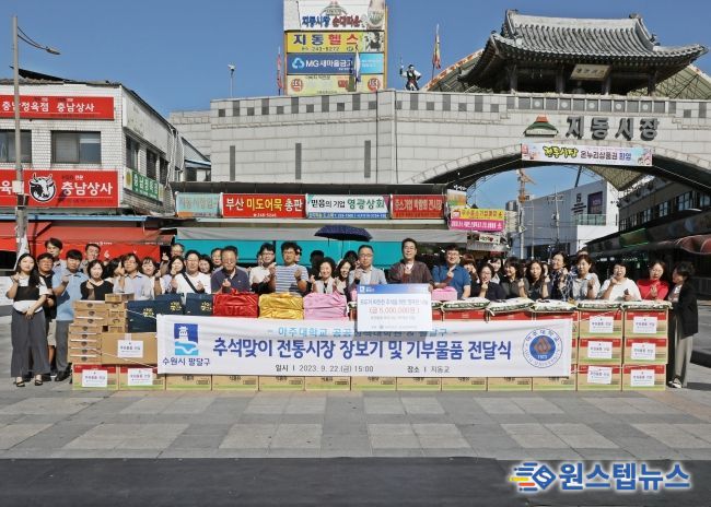 22일 아주대학교 공공정책대학원은 추석을 맞아 팔달구 전통시장에서 장보기를 통해 지역경제 활성화에 힘을 보탰으며, 전통시장에서 구입한 식용유, 쌀, 건어물 등 500만원 상당의 물품을 경로당, 지역아동센터 등 복지시설 105개소에 전달했다.