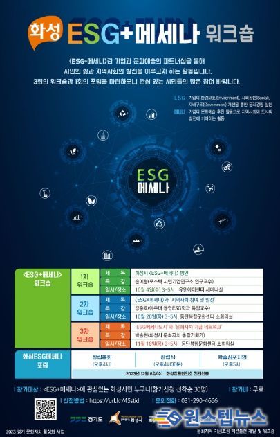 화성'ESG+메세나' 워크숍은 ‘2023 경기 문화자치 활성화 사업’의 일환으로 기업과 예술의 파트너십을 통해 시민의 삶과 지역사회의 발전을 이루고자 하는 사업이다. 10~11월 총 3회의 워크숍과 12월의 포럼에는 ESG와 메세나에 관심 있는 시민이면 누구나 참여 가능하다.