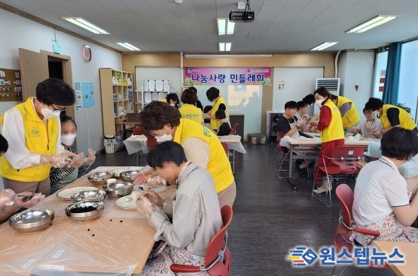 수원시 나눔사랑민들레봉사단 회원 등 20여 명은 에이블 장애인직장 적응 훈련센터 훈련생들과 함께 송편, 강정을 만들어 먹었다.