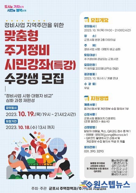 맞춤형 주거정비 시민강좌는 군포시 재건축, 재개발, 리모델링, 소규모 정비까지 사업의 주체에 대한 올바른 정보와 객관적인 비교로 강의가 진행되는 만큼 주거정비에 관심 있는 군포시민이면 누구나 신청하여 수강할 수 있으며 수강을 희망하는 시민은 10월 18일 13시 까지 QR코드 또는 담당자 이메일로 선착순 접수하면 된다.