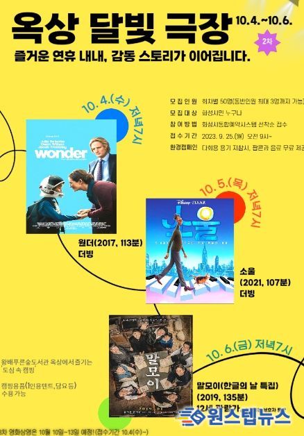 원스텝뉴스 천수호 기자 | 화성시립왕배푸른숲도서관(운영: 화성시문화재단)은 황금연휴를 맞이해 10월 4일부터 6일까지 19시 도서관 3층 옥상쉼터에서 ‘옥상 달빛 극장’을 집중 운영한다.