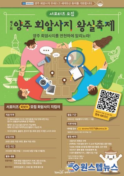 원스텝뉴스 천규영 기자 | 양주시는 오는 12일까지 ‘제7회 양주 회암사지 왕실축제’ 서포터즈 ‘회암이’에 참여할 시민을 모집한다고 밝혔다.