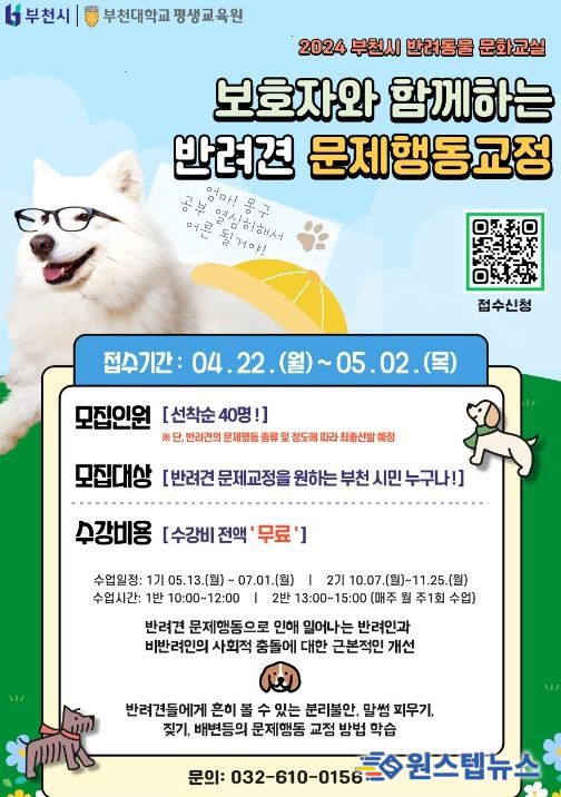 원스텝뉴스 이병희 기자 | 부천시는 오는 5월 13일부터 11월 25일까지 부천대학교 소사캠퍼스에서 ‘반려견 문제행동교정 문화교실’을 운영한다고 밝혔다.