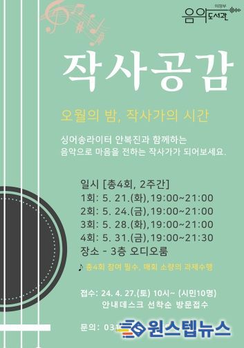 원스텝뉴스 천규영 기자 | 의정부음악도서관은 음악을 더 깊이 있게 경험해 볼 수 있는 가사 쓰기 프로그램 ‘작사공감’을 5월 21일부터 31일까지 총 4회 운영한다.