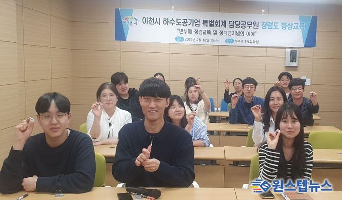원스텝뉴스 이병희 기자 | 이천시 상하수도사업소는 하수도공기업 소속 직원들의 청렴 인식개선 및 청렴 문화 정착을 위하여 4월 18일 전 직원을 대상으로 “2024년 청렴도 향상 교육”과 함께 “청렴 실천을 결의”하는 자리를 마련했다.