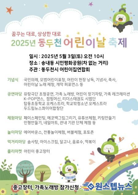 원스텝뉴스 천규영 기자 | 동두천시는 제103회 어린이날을 맞아 오는 5월 3일 토요일 오전 10시부터 차 없는 거리로 운영되는 시민평화공원 일대에서 『2025년 꿈꾸는 대로, 상상한 대로 동두천 어린이날 축제』를 개최한다고 밝혔다.