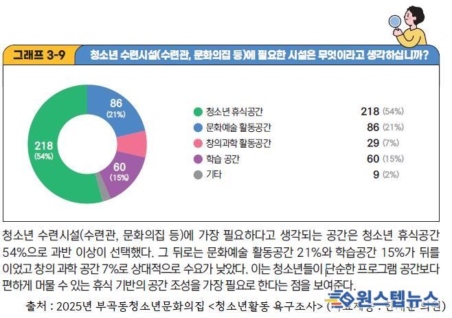 부곡동청소년문화의집 응답 청소년의 절반 이상인 54%는 청소년 전용 휴식공간이 필요하다고 답했고, 포일 청소년문화의집 조사 역시 가장 필요한 공간으로 휴식공간을 1순위(36%)로 꼽았다.