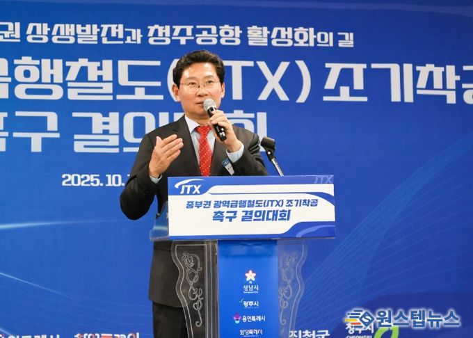 이 시장은 이날 오후 청주국제공항 여객청사에서 열린 ‘중부권 광역급행철도(JTX) 조기착공 촉구 결의대회’에서 지난 8월 국토교통부가 한국개발연구원에 의뢰한 민자적격성 조사가 신속하게 통과돼 철도 신설을 위한 착공이 조기에 이뤄져야 한다고 강조했다.