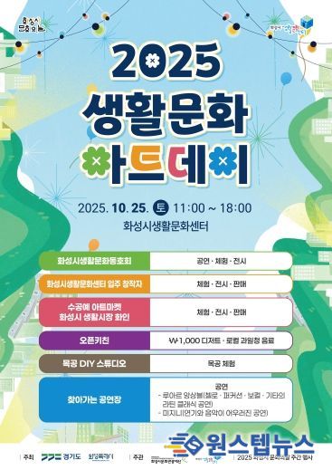 원스텝뉴스 천규영 기자 | 화성시문화관광재단(대표이사 안필연)은 오는 10월 25일 토요일에 화성시생활문화센터에서 ‘2025 생활문화 아트데이’를 개최한다. 이번 행사는 ‘2025 화성시 문화의 날’ 주간을 맞아 시민들에게 생활문화를 체험하고 즐길 수 있는 기회를 제공하고, 지역 생활문화 활동가의 활동 기반을 마련하기 위해 기획됐다.