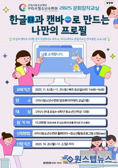 원스텝뉴스 천규영 기자 | 구리시청소년재단 청소년수련관은 청소년들의 디지털 문해력 향상과 자기 표현력 강화를 위한 실습형 프로그램 '한글과 캔바로 만드는 나만의 프로필'의 참가자를 10월 20일부터 11월 2일까지 수련관 홈페이지에서 선착순 모집한다고 밝혔다.