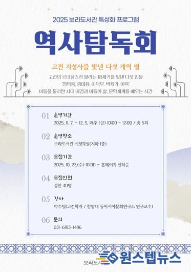 원스텝뉴스 천규영 기자 | 용인특례시 보라도서관은 오는 11월 7일부터 12월 5일까지 고전 인문학 프로그램으로 ‘2025 역사 탐독회’를 운영한다고 21일 밝혔다.