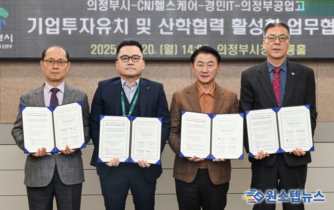 원스텝뉴스 이병희 기자 | 의정부시는 10월 20일 시청 회룡홀에서 ㈜CNJ헬스케어, 경민IT고등학교, 의정부공업고등학교와 함께 ‘기업투자유치 및 산학협력 활성화’를 위한 업무협약을 체결했다.