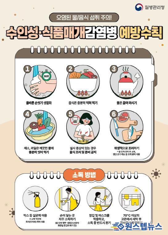 수인성·식품매개감염병은 손 씻기 등 기본적인 개인위생과 올바른 조리·보관 방법만 지켜도 충분히 예방할 수 있다. ▲흐르는 물에 30초 이상 비누로 손 씻기 ▲음식은 충분히 익혀 먹기 ▲물은 끓여 마시기 ▲ 채소나 과일은 깨끗한 물에 충분히 씻기 ▲설사 증상이 있는 경우 음식을 조리하지 않기 ▲음식 종류별로 구분해서 조리 도구 사용하고 소독하기 등 예방수칙을 준수하는 것이 중요하다.