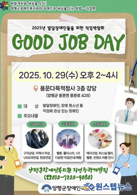 원스텝뉴스 천규영 기자 | 대한불교조계종사회복지재단이 운영하는 양평군장애인복지관은 오는 29일 오후 2시부터 4시까지 용문다목적청사 3층 강당에서 발달장애인의 직업 탐색 기회를 지원하기 위한 직업박람회 ‘GOOD JOB DAY’를 개최한다.