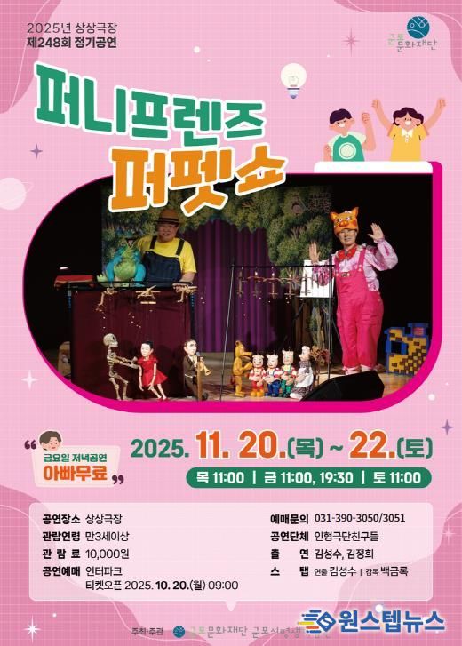 원스텝뉴스 천규영 기자 | 군포문화재단 군포시평생학습원 상상극장은 오는 11월 20일부터 22일까지 정기공연으로 인형극 ‘퍼니프렌즈 퍼펫쇼’를 무대에 올린다.