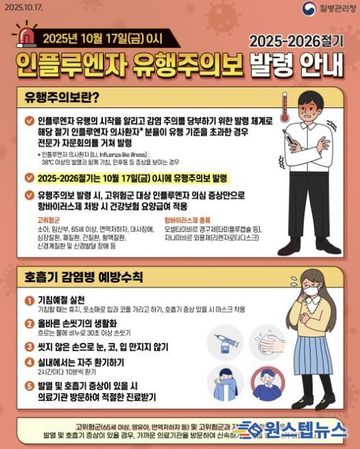 군은 질병관리청이 이달 17일 ‘2025~2026절기 인플루엔자 유행주의보’를 발령함에 따라, 호흡기 감염병 확산을 막기 위한 예방접종과 개인 위생수칙 준수를 적극 권고하고 있다. 인플루엔자는 기침이나 콧물 등 호흡기 분비물을 통해 전파되며, 고열과 인후통, 근육통 등을 동반한다. 특히 고령자, 임신부, 만성질환자 등 고위험군은 폐렴 등 합병증 위험이 높아 조기 접종이 무엇보다 중요하다.