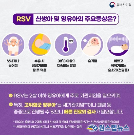 부모가 꼭 확인해야 할 중증 의심 신호는 ▲ 숨을 빠르게 쉬거나 쌕쌕거리는 호흡음이 들리는 경우 ▲ 수유량이 줄거나 보채는 횟수 증가 ▲ 38도 이상의 발열이 계속되거나 증상이 빨리 악화 되는 경우로 즉시 의료기관 방문이 필요하다.