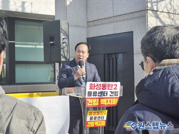 원스텝뉴스 이병희 기자 | 이권재 오산시장은 17일 오후 12시, 화성시청에서 열린 집회에서 화성시의 초대형 물류센터 건립 계획을 규탄하고, 사업 전면 철회를 강력히 요구했다.