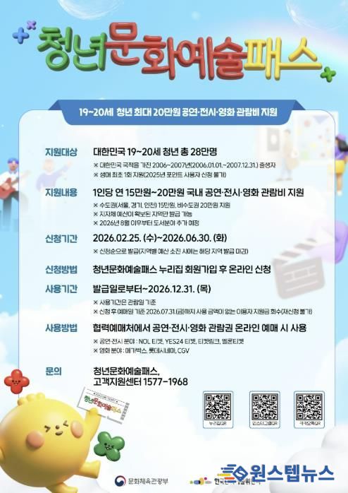 청년문화예술패스는 문화체육관광부와 한국문화예술위원회가 주최·주관하는 사업으로 청년들이 공연·전시·영화 등 다양한 문화예술을 부담 없이 경험할 수 있도록 1인당 최대 수도권 기준 15만원까지 문화 향유 비용을 지원하는 제도다. 이를 통해 청년들의 문화 접근성을 높이고 문화예술을 일상 속에서 즐길 수 있도록 돕는 것이 목적이다.