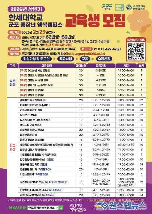 원스텝뉴스 이병희 기자 | 군포시가 인생 2막 설계와 사회참여 확대의 기회를 제공하고자 중장년 세대를 대상으로 2026년 상반기 중장년 행복캠퍼스 교육생을 모집한다고 밝혔다.