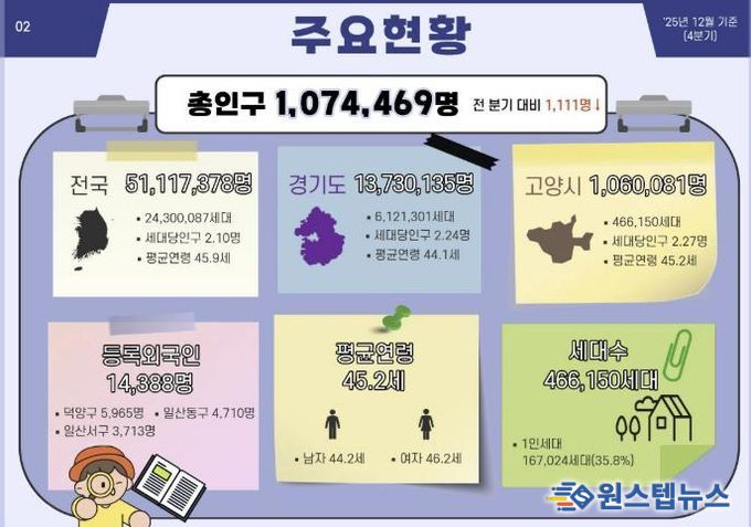 원스텝뉴스 이병희 기자 | 고양특례시가 저출생·고령화 등 급변하는 인구구조 변화에 선제적으로 대응하기 위해 ‘고양시 인구현황 브리핑’을 운영한다. 시는 인구 규모와 연령구조, 출생·사망, 인구이동 등 주요 지표를 행정동 단위까지 세분화해 인포그래픽으로 시각화하고, 이를 시청 홈페이지 행정자료방을 통해 정례적으로 공개할 계획이다.