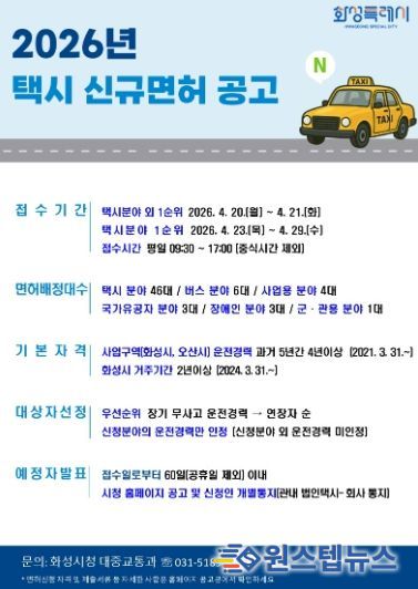 면허 신청 접수는 화성특례시청 민원실에서 진행하며 분야별로 접수 기간이 다르다. ▲택시 분야 외 1순위는 4월 20일부터 21일까지 ▲택시 분야 1순위는 4월 23일부터 29일까지 접수한다. 시는 이후 면허 심사와 예정자 공고, 이의신청 기간을 거쳐 오는 7월 중 신규 면허 발급 대상자를 최종 확정하고 면허증을 수여할 계획이다.