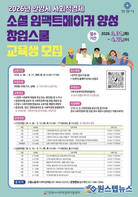 원스텝뉴스 이병희 기자 | 안양시가 오는 4~6월 운영되는 ‘2026 안양시 사회적경제 소셜 임팩트메이커 양성 창업스쿨(이하 창업스쿨)’에 참여할 교육생을 오는 4월 22일까지 모집한다고 31일 밝혔다.