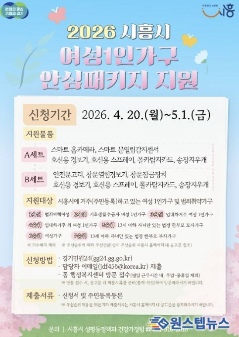 원스텝뉴스 이병희 기자 | 시흥시는 관내 여성 1인 가구 등의 안전한 일상 보호를 위해 ‘2026년 시흥시 여성 1인 가구 안심패키지 지원사업’을 추진하고, 오는 4월 20일부터 5월 1일까지 신청을 받는다.