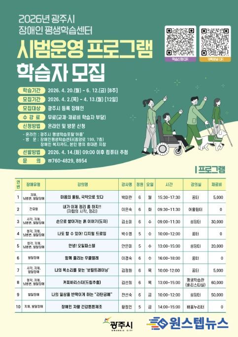 모집 기간은 2일부터 13일까지며 광주시 평생학습포털 ‘어흥’을 통한 온라인 접수 또는 장애인 평생학습센터 방문 접수가 가능하다. 방문 신청 시에는 장애인 복지 카드와 본인 명의 휴대전화를 지참해야 한다.