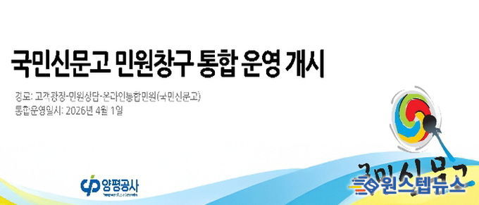 원스텝뉴스 이병희 기자 | 양평공사는 군민 중심의 민원 서비스를 강화하고 민원 처리의 신속성과 효율성을 높이기 위해 국민권익위원회가 운영하는 ‘국민신문고’ 시스템을 도입해, 4월 1일부터 전 시설을 대상으로 통합 민원창구 운영을 전면 시행한다고 밝혔다.