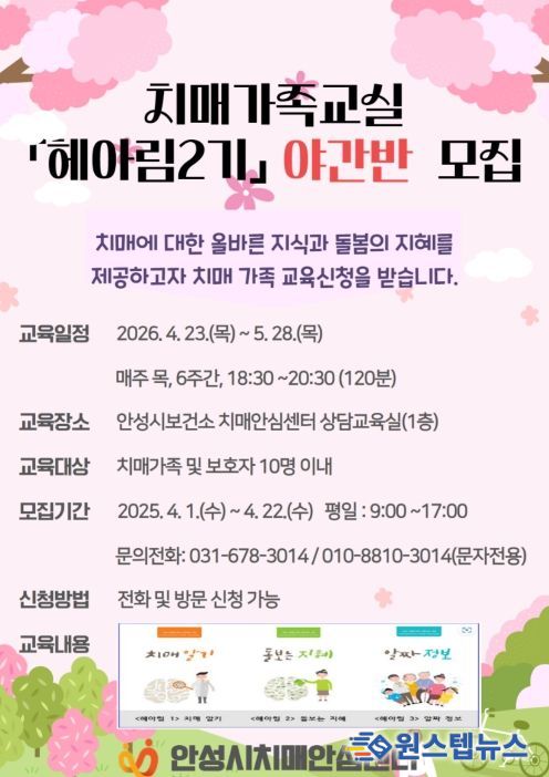 원스텝뉴스 이병희 기자 | 안성시보건소 치매안심센터가 직장이나 생업으로 낮시간대 교육받기 어려운 치매환자 가족을 위하여 오는 23일부터 가족교실 야간반을 운영한다.