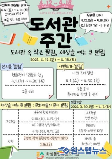 이번 도서관주간 프로그램은 아동과 성인을 대상으로 하는 다양한 강좌 및 강연으로 구성되어 있고, 도서관주간의 주제 “도서관 속 작은 펼침, 세상을 여는 큰 열림”을 반영한 다채로운 북큐레이션과 전시도 진행될 예정이다.