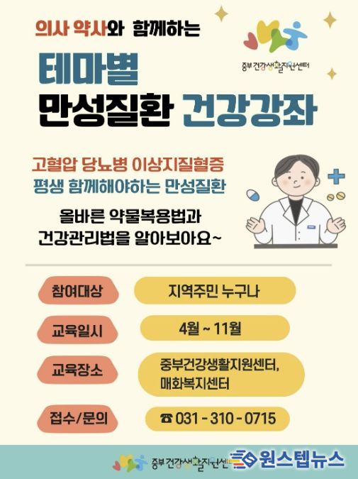 특히 4월에는 약사가 진행하는 ‘올바른 혈압약·당뇨약 복용법’ 강좌가 두 차례 운영된다. 4월 7일 오전 10시 30분에는 중부건강생활지원센터에서, 4월 14일 오전 10시 30분에는 매화복지관에서 각각 열린다.