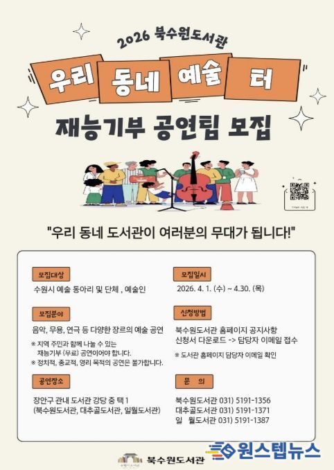 원스텝뉴스 이병희 기자 | 북수원·대추골·일월도서관은 시민 참여 문화공연 ‘우리동네 예술 터’에 참여할 재능기부 공연팀을 4월 30일까지 모집한다.