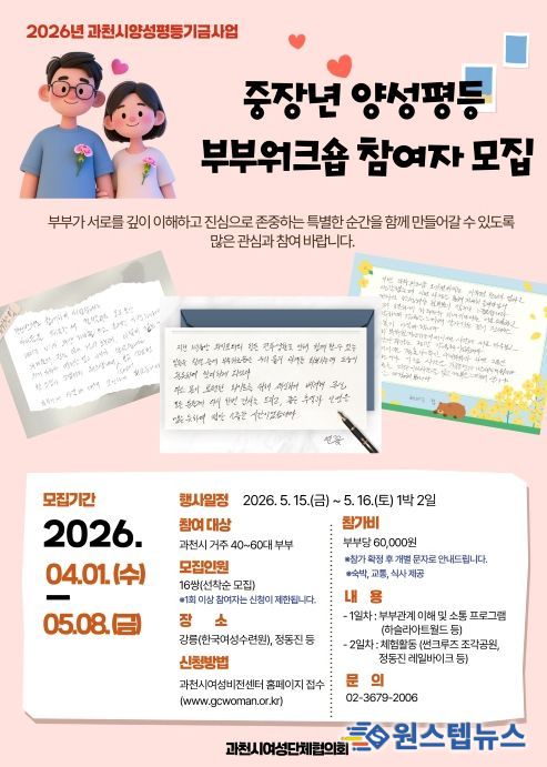 원스텝뉴스 이병희 기자 | 과천시는 중장년 부부의 건강한 관계 형성과 양성평등한 가족문화 확산을 위해 ‘중장년 양성평등 부부워크숍’을 추진하며, 참여자를 모집 중이라고 3일 밝혔다.