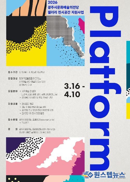 원스텝뉴스 이병희 기자 | (재)광주시문화재단은 ‘2026 광주시문화예술의전당 갤러리 전시공간지원사업 'Platform'’ 참여 작가를 4월 10일까지 공모한다.