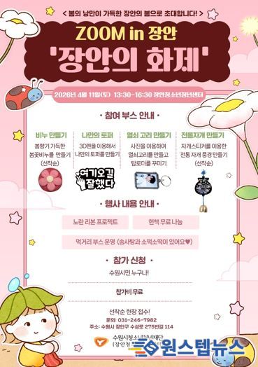 원스텝뉴스 이병희 기자 | 수원시청소년청년재단 장안청소년청년센터는 오는 4월 11일, 봄의 낭만을 가득 담은 프로그램 ZOOM IN 장안 ‘장안의 화제’를 개최한다고 밝혔다.