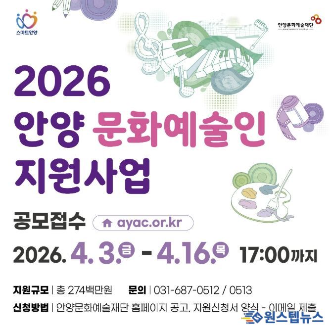 원스텝뉴스 이병희 기자 | 안양문화예술재단은 지역 예술인의 창작활동을 지원하고 문화예술 진흥을 도모하기 위한 ‘2026년 안양 문화예술인 지원사업’ 희망자를 오는 16일 17시까지 공개 모집한다.