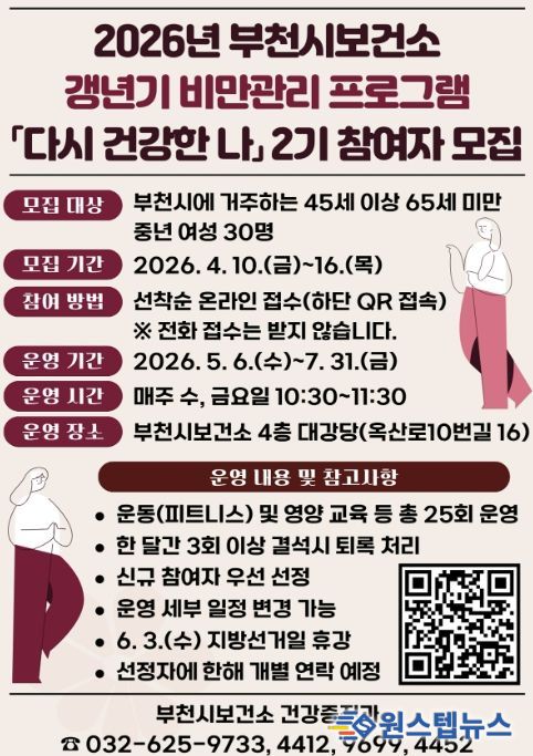 원스텝뉴스 이병희 기자 | 부천시보건소는 중년 여성의 건강한 삶을 지원하기 위해 4월 10일부터 16일까지 갱년기 비만관리 프로그램 ‘다시 건강한 나’ 2기 참여자를 모집한다.