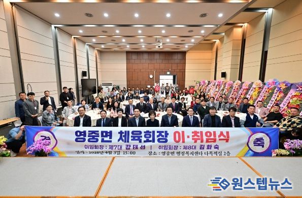 원스텝뉴스 천규영 기자 | 포천시 영중면 행정복지센터는 지난 3일 영중면 체육회장 이·취임식을 열고, 제7대 강태선 회장의 이임과 제8대 김화숙 회장의 취임을 축하했다.