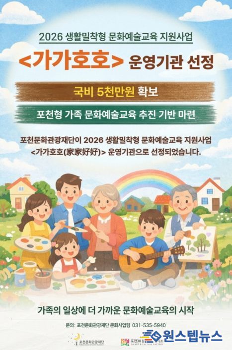 원스텝뉴스 이병희 기자 | 포천문화관광재단이 2026 생활밀착형 문화예술교육 지원사업 ‘가가호호(家家好好)’ 운영기관 공모에 최종 선정됐다.