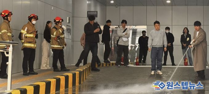 훈련은 화재 발생 시 행동 요령 교육을 시작으로 ▲연기 발생 상황을 가정한 대피 훈련 ▲교육용 소화기 사용 실습 ▲옥내 소화전 살수 실습 순으로 진행됐으며, 참가자들은 실제 화재 상황에 대비한 대응 능력을 체득했다.