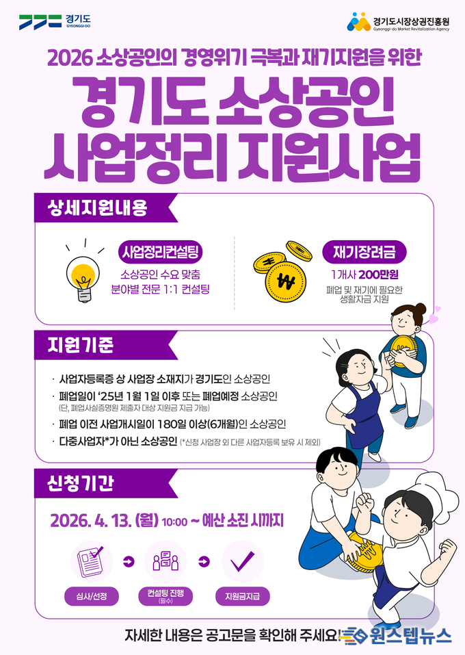 경기도시장상권진흥원(이하 경상원)은 도내 경영 위기로 폐업했거나 폐업을 앞둔 소상공인들의 안정적인 재기를 돕기 위해 ‘2026년 경기도 소상공인 사업정리 지원사업’을 추진한다고 밝혔다.