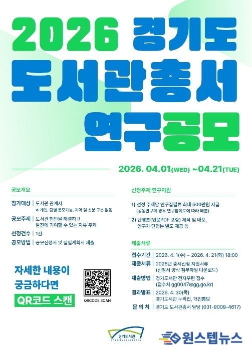 원스텝뉴스 이병희 기자 | 경기도는 도서관 현장의 문제 해결과 서비스 혁신을 위한 ‘2026 경기도 도서관총서 연구 공모’를 추진한다고 7일 밝혔다.