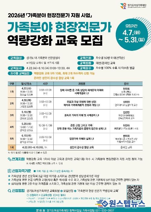 모집대상은 경기도 내 가족분야 전문상담사이며, 교육은 차수별 50명 내외로 총 5차에 걸쳐 운영된다. 신청기간은 4월 7일부터 5월 31일까지이며, 재단 누리집을 통해 차수별로 선착순 모집한다.