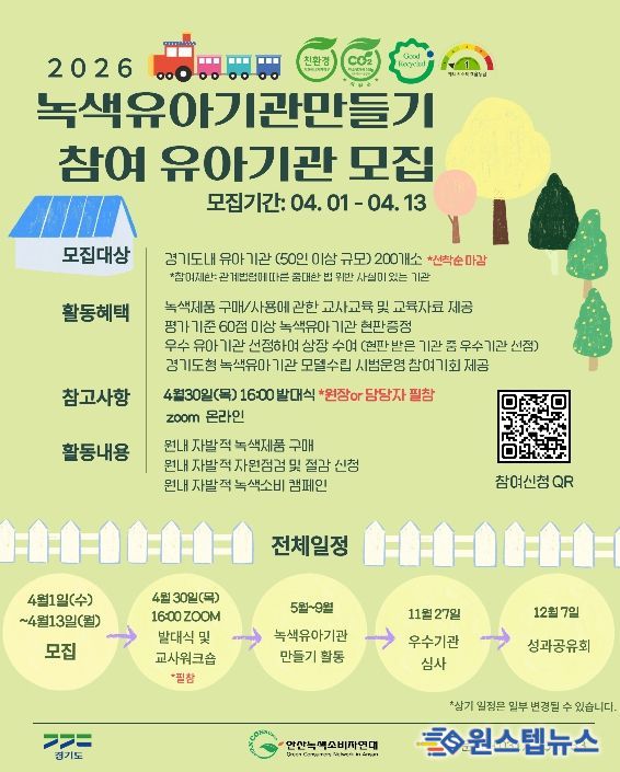 원스텝뉴스 이병희 기자 | 경기도가 아이들이 생활 속에서 올바른 녹색 소비 습관을 가질 수 있도록 돕는 ‘2026년 녹색유아기관만들기’ 참여 기관 200곳을 4월 13일까지 모집한다.