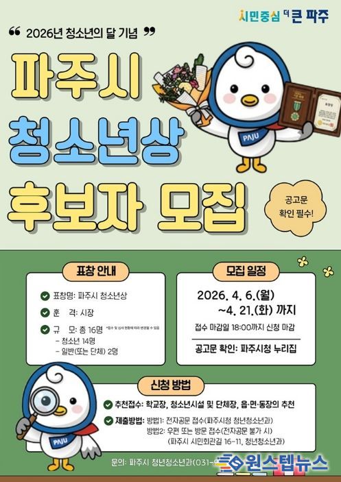 원스텝뉴스 이병희 기자 | 파주시는 타의 모범이 되는 청소년 및 청소년지도자(또는 단체)를 선발·시상하는 ‘파주시 청소년상’후보자를 오는 4월 21일까지 추천받는다.