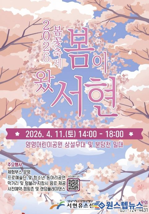 양경석 성남시청소년청년재단 대표이사는 “흐드러지게 핀 벚꽃길 아래에서 청소년·청년과 지역 주민이 소통하며 소중한 추억을 만들기를 바란다”며 “철저한 안전관리를 바탕으로 온 가족이 안심하고 봄의 정취를 만끽할 수 있는 서현유스센터 대표 브랜드 축제로 운영하겠다”고 밝혔다.
