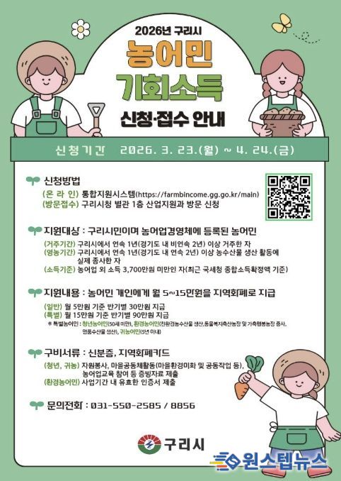 원스텝뉴스 이병희 기자 | 구리시는 ‘2026년 농어민 기회 소득 지원사업’ 신청을 오는 4월 24일까지 접수한다고 밝혔다.